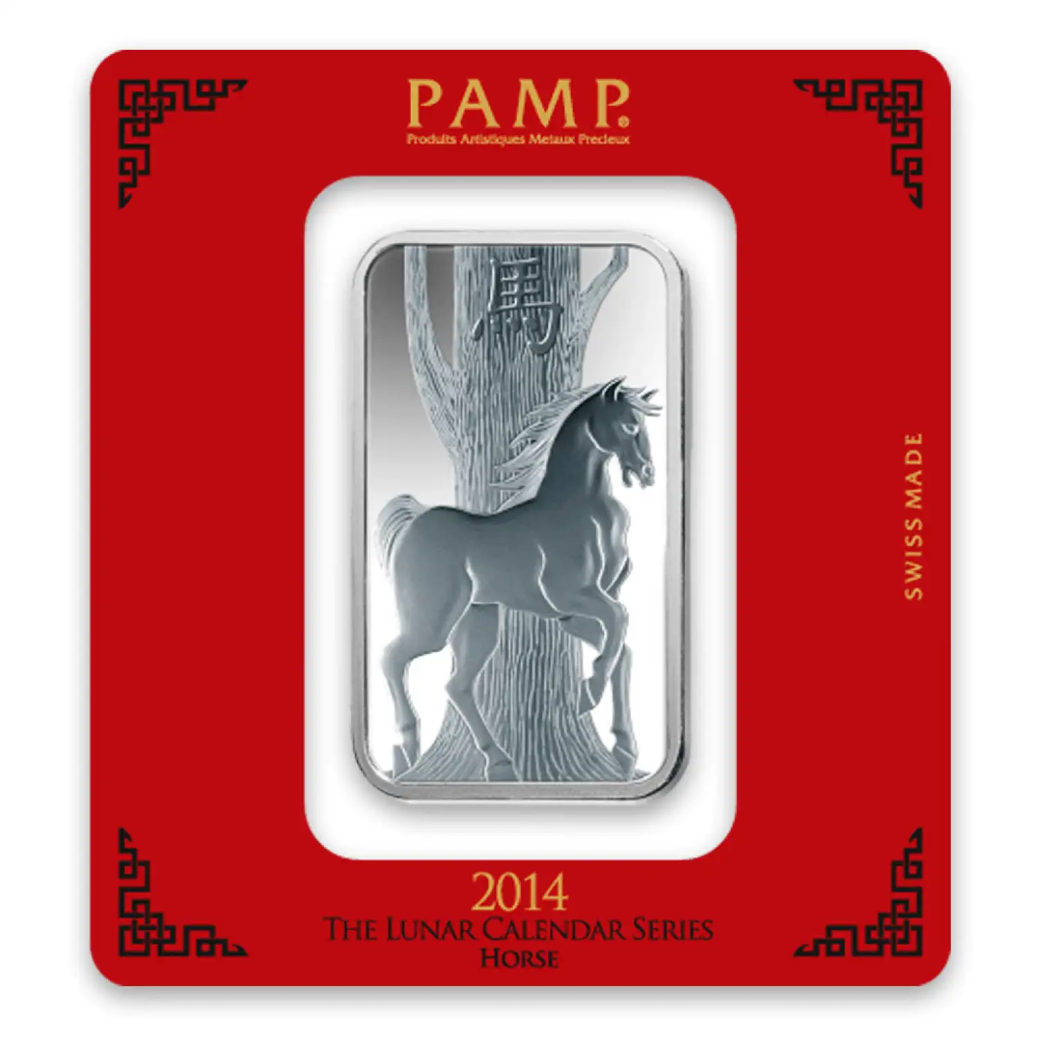 The 100g PAMP Silver Bar - Lunar Horse is manufactured in Switzerland and is composed of 100 grams of .999 pure silver. This beautiful silver bar features a horse design for the Chinese Zodiac series on the obverse.