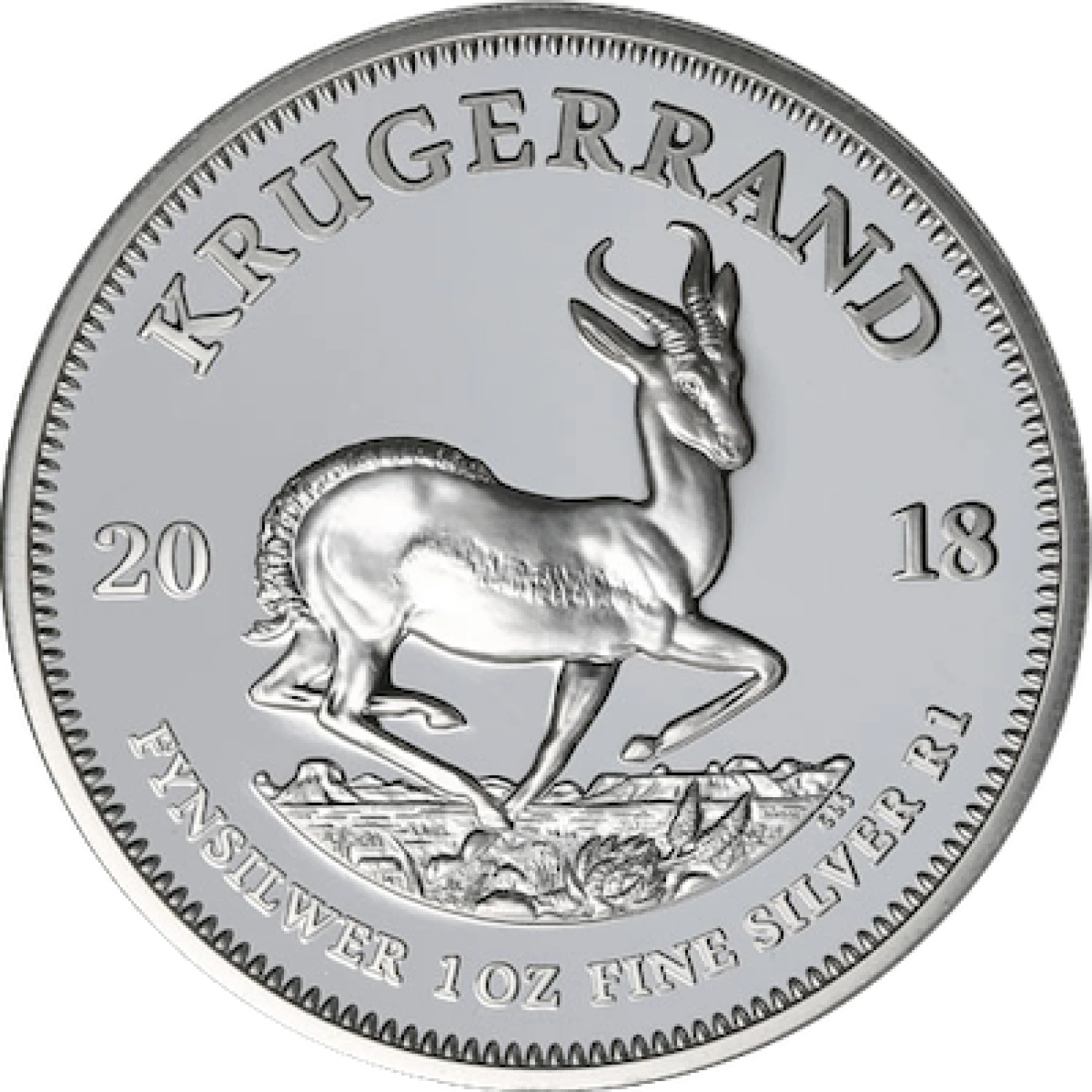 The reverse of this silver coin is the springbok, South Africa’s national animal. The Springbok or Antidorcas marsupialis is characteristic for its jumping ability. Modeled by the renowned South African sculptor, Coert Steynberg. On the obverse of the coin is Paul Kruger, South Africa's famous leader. The word "Krugerrand" is derived from Paul Kruger and the rand, the monetary unit of South Africa, which is associated with the Witwatersrand ‚the ridge of white water‘ – the gold producing area discovered in 1886 in South Africa.