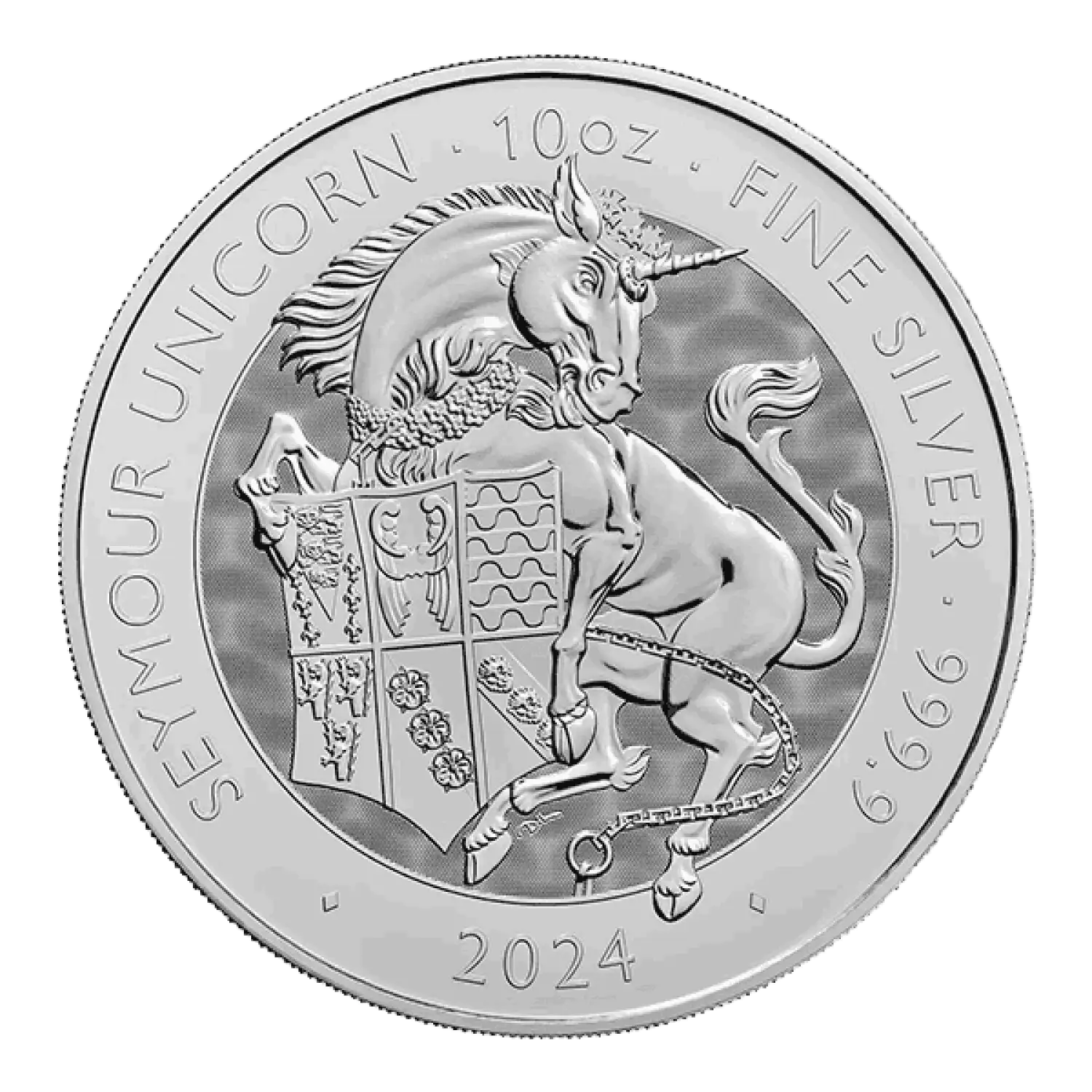 On the reverse side of the 2024 10 oz British Tudor Beasts Seymour Unicorn Coin, you will find the imposing Seymour Unicorn. This mythical Tudor Beast, originally bestowed upon Jane Seymour, is depicted in captivity, restrained by a chain while grasping a six-quartered shield.