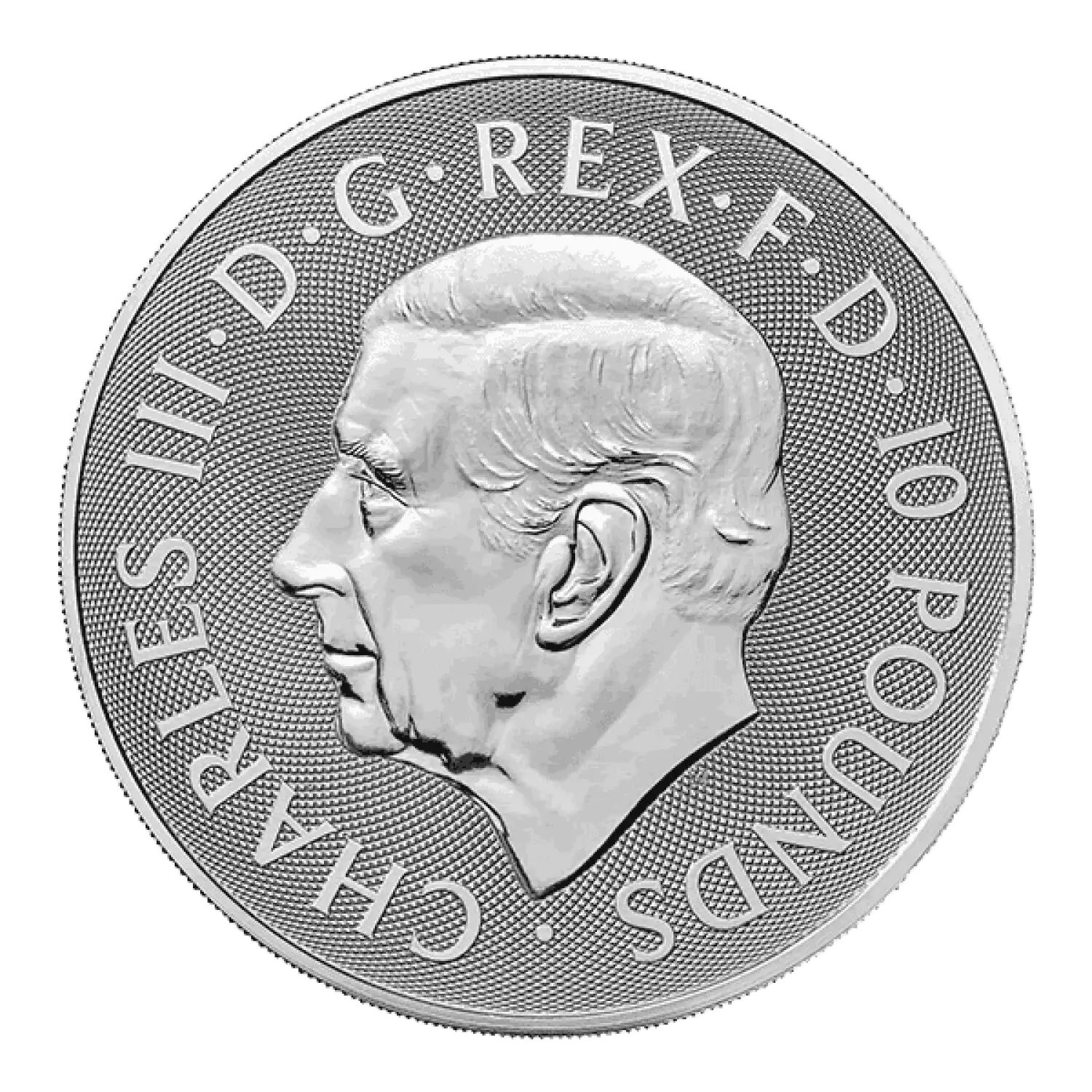 The obverse field of the 2024 10 oz Silver Tudor Beasts Seymour Unicorn Coin showcases the left-profile portrait of King Charles III. This intricately designed effigy, crafted by Martin Jennings, presents the King without a crown, while identifying marks of the coin surround the portrait.